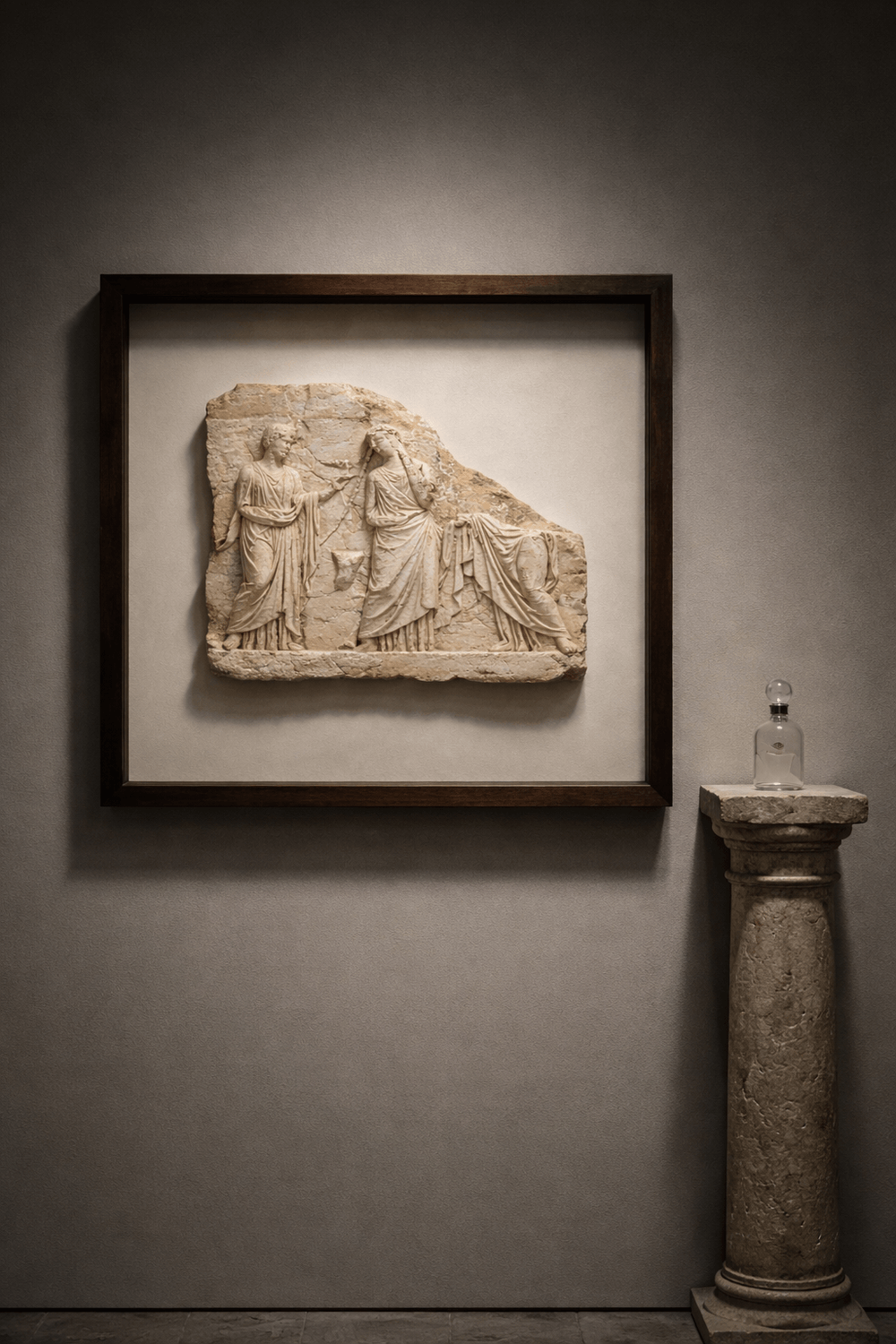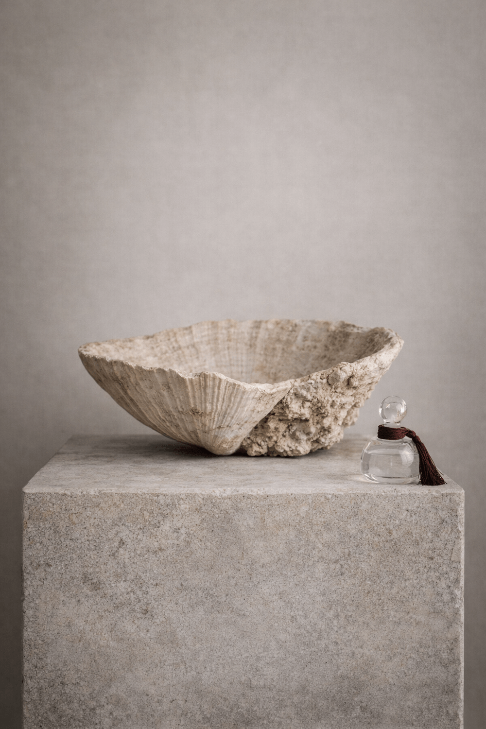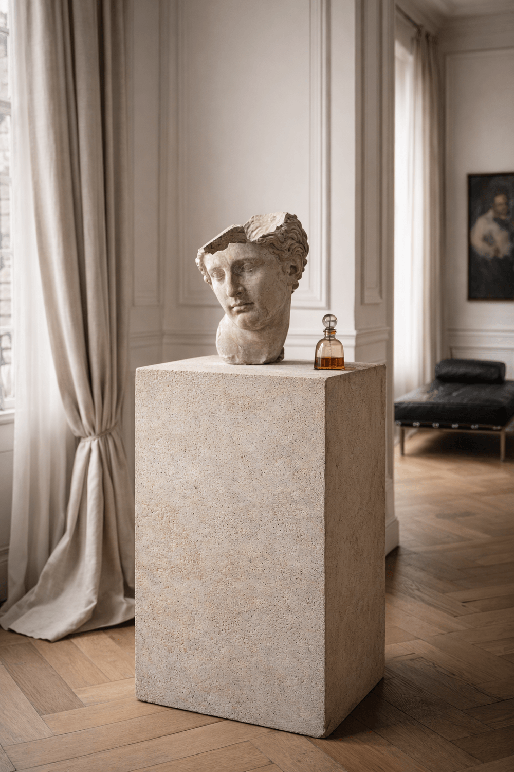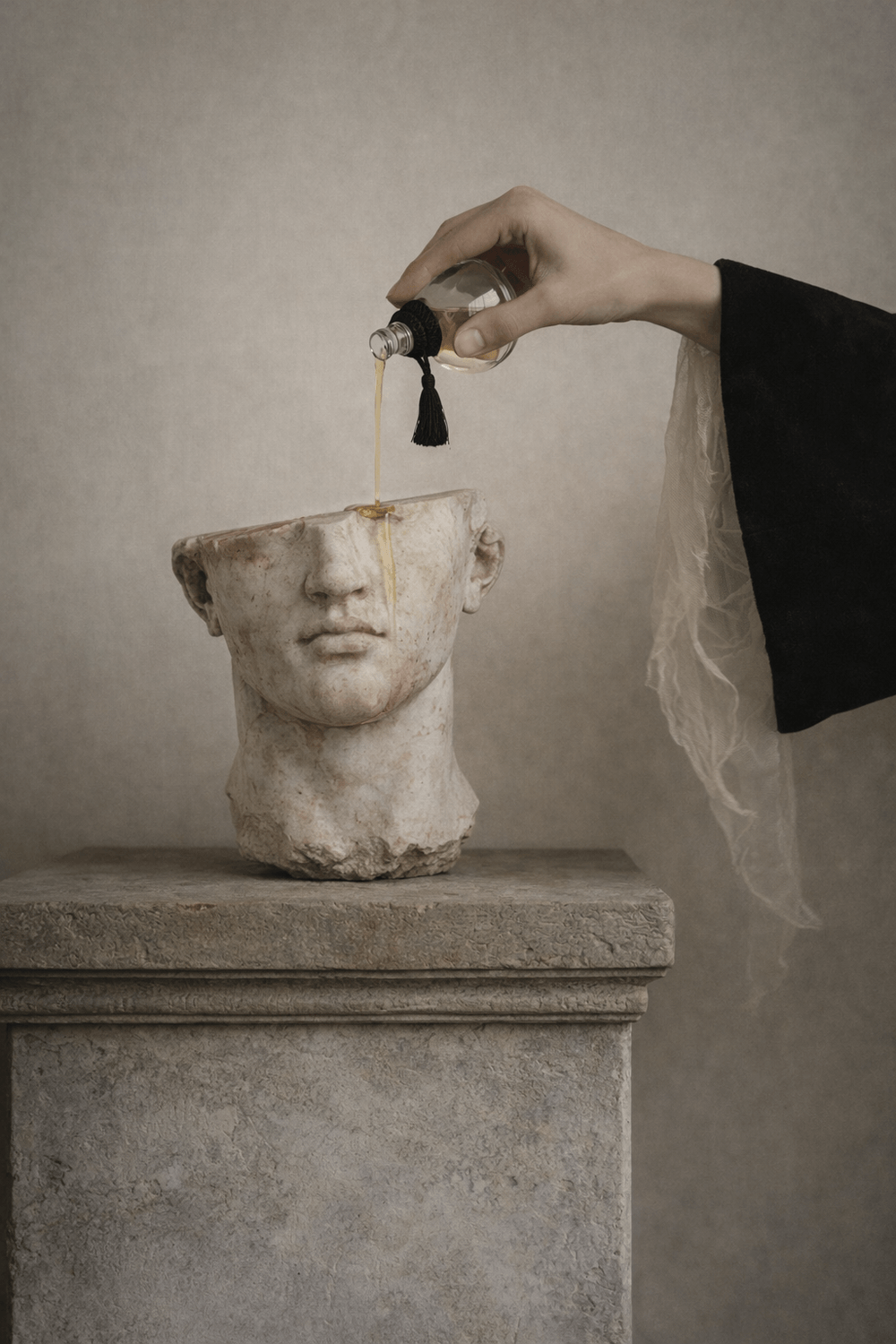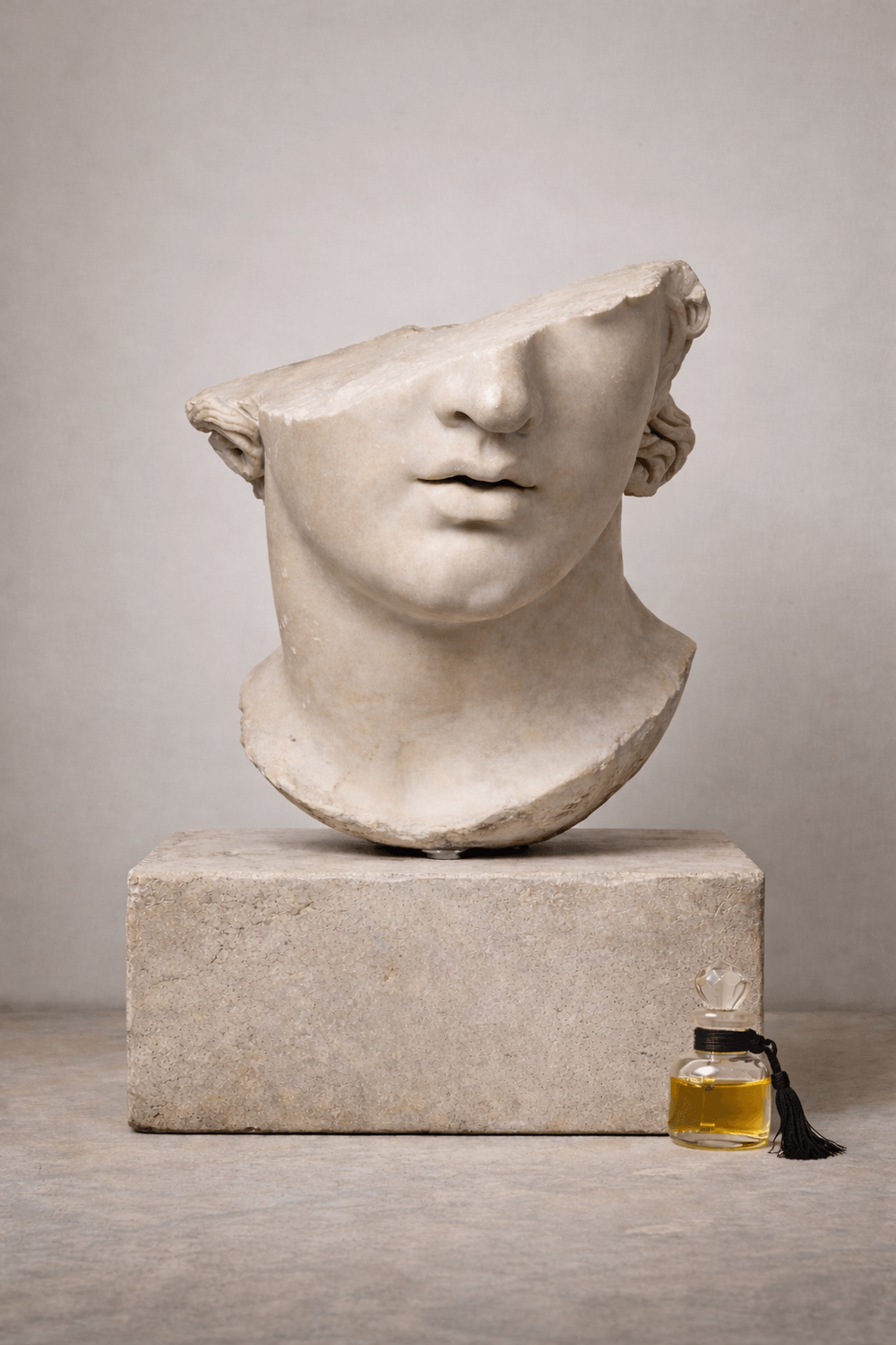 This sculptural fragment returns to a historical moment in which the human figure was central to philosophical inquiry and aesthetic thought. It comes with a vessel containing myrrh oil sourced from Mount Athos. When applied over the sculpture, the porous stone absorbs the fragrance and gradually releases it, transforming the art piece into a silent diffuser.