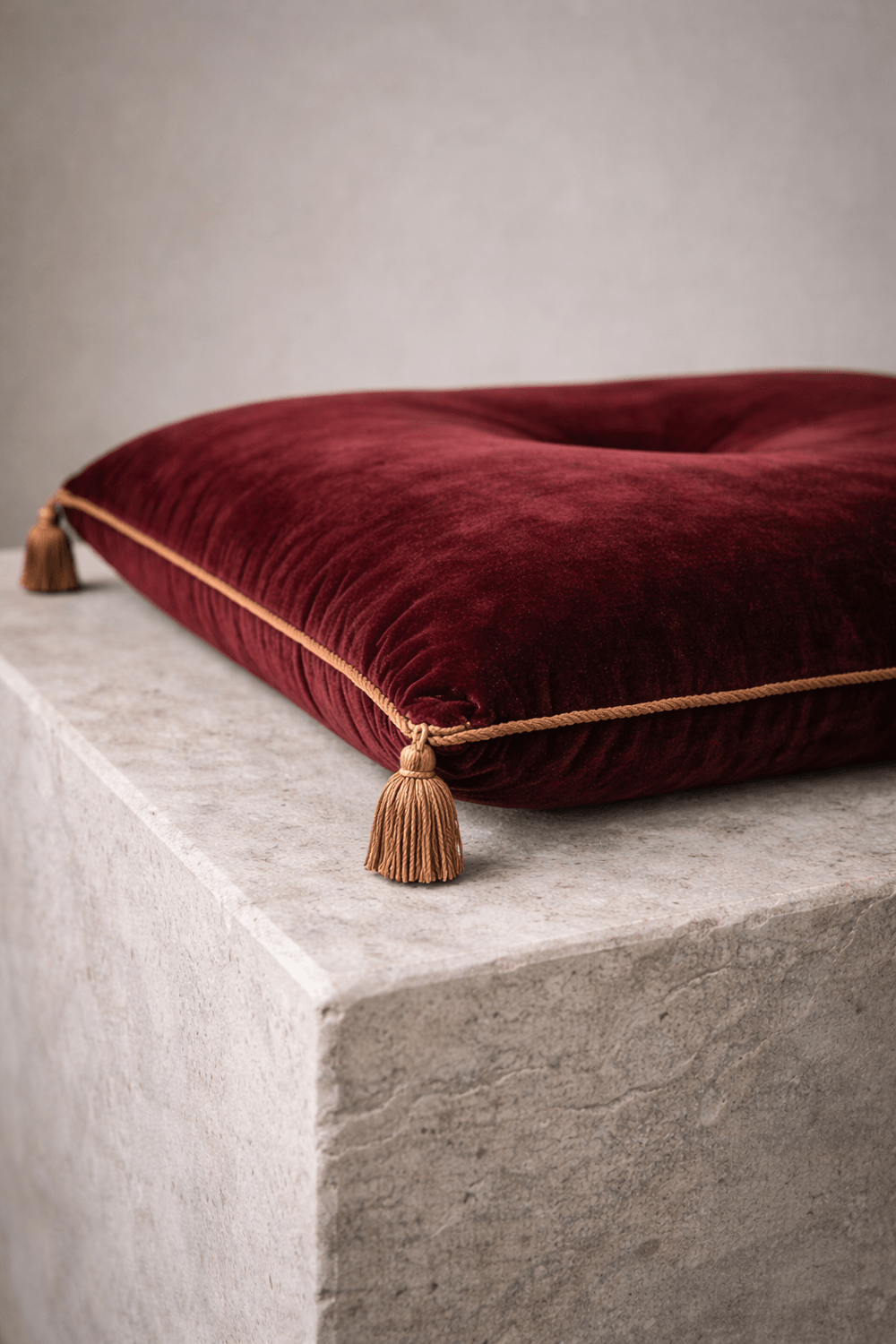 This velvet pillow bears a suggestive indentation as if a crown had rested upon it over time. Referencing ceremonial or museum display cushions, it becomes a meditation on sovereignty, rest, and impermanence. Filled with dried aromatic herbs and flowers collected by monks in Romania, the pillow carries scent as a historic presence.