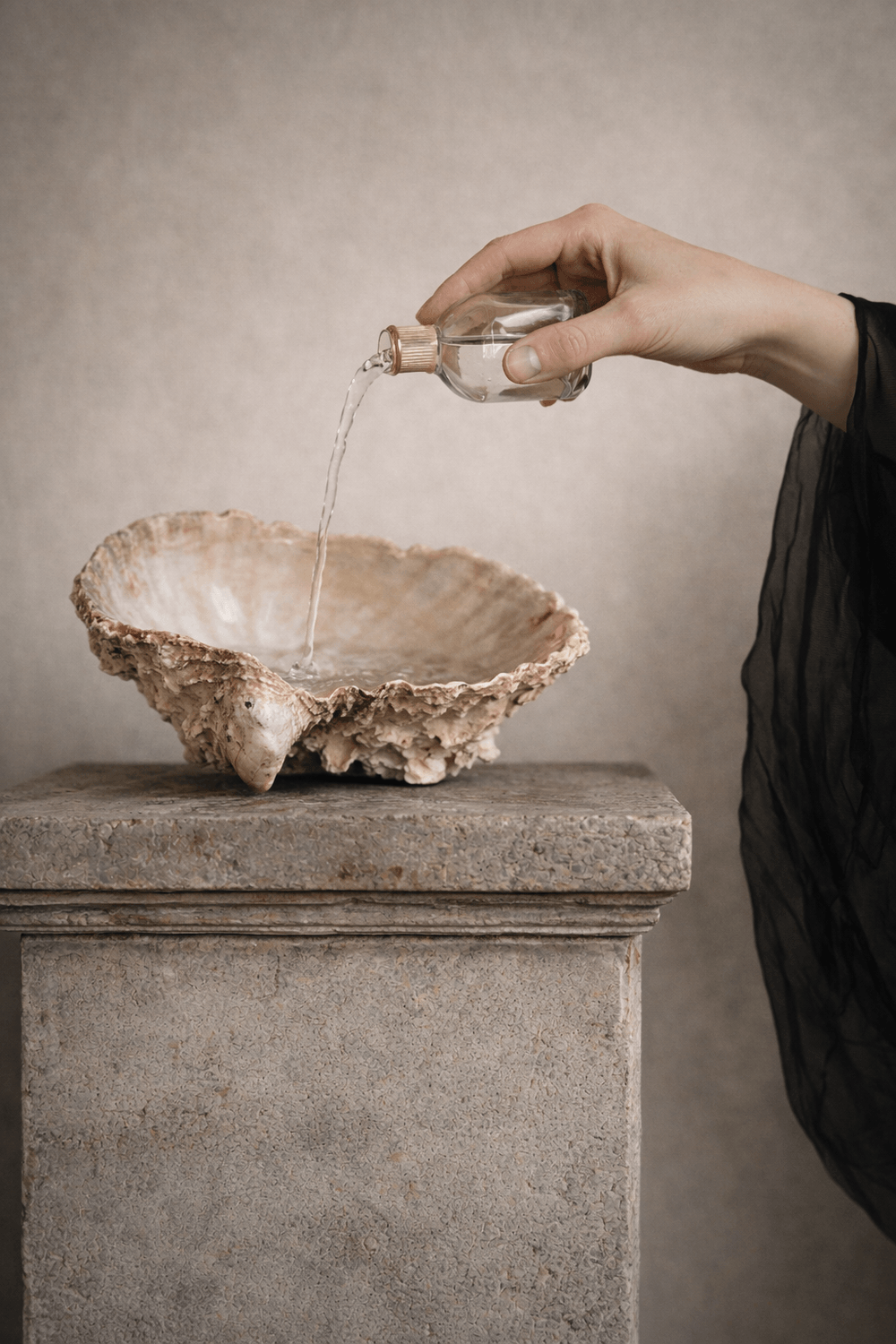 The shell, shaped by an unseen underwater world, evokes both distance and depth. Its form recalls ecclesiastical fonts designed to hold Holy water. Accompanied by water drawn from a Romanian monastery, the object situates itself between nature and ritual, suggesting containment and the persistence of the sacred within organic forms.
