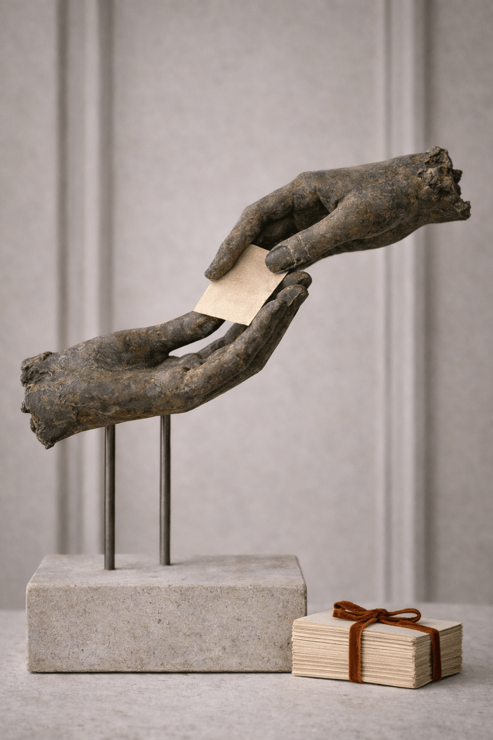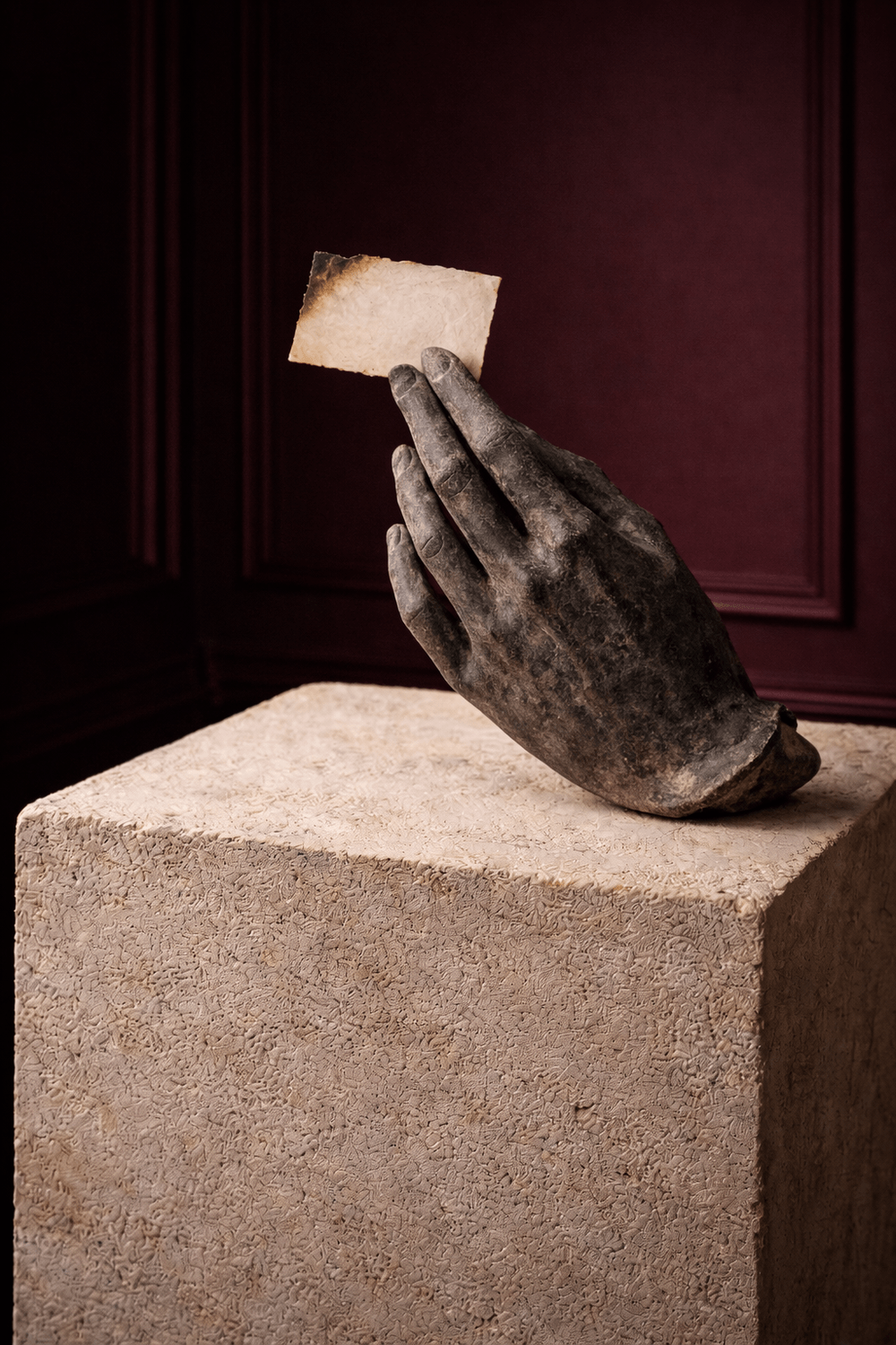 These fragmented hands, rendered in stone and bronze, adopt a gesture derived from spiritual iconography. The symbolize neither possession nor release, but transmission. Held by them is a strip of Papier d’Arménie, the 19th-century densley perfumed paper known for burning without flame. The paper functions as a message, activating the sculpture through heat.