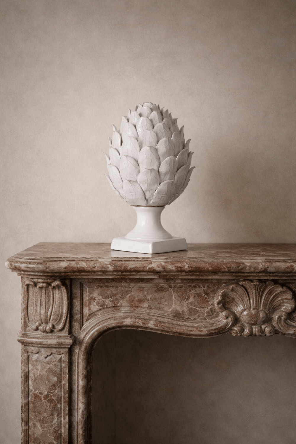 The artichoke, traditionally associated with peace and inwardness, here becomes an object of layered meaning. Its structure encloses a hollow core, allowing it to function as an incense or Papier d’Arménie burner. Fragrance emerges discreetly, reinforcing the symbolism of concealment, protection, and the slow revelation of an interior.