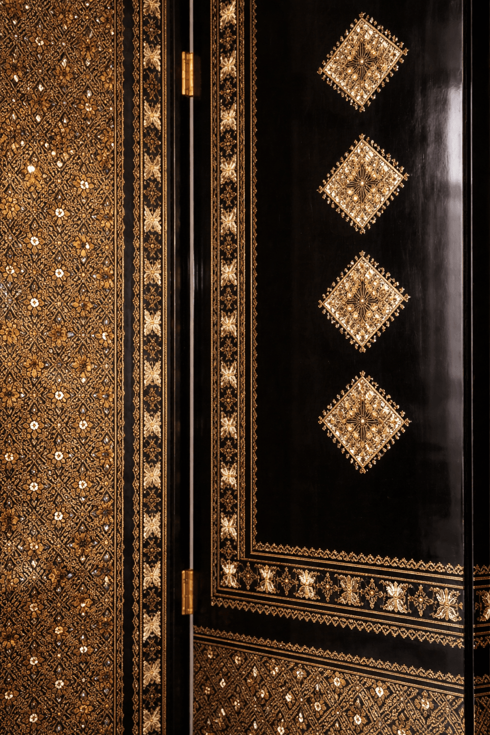 The partition object functions simultaneously as spatial divider and protective surface. Created from hardwood and handpainted with gold, silver, and mother-of-pearl, it draws its ornamental vocabulary from the Romanian fota, a traditional embroidered apron worn by women. Privacy, ornament, and defense converge in an object that both reveals and shields.