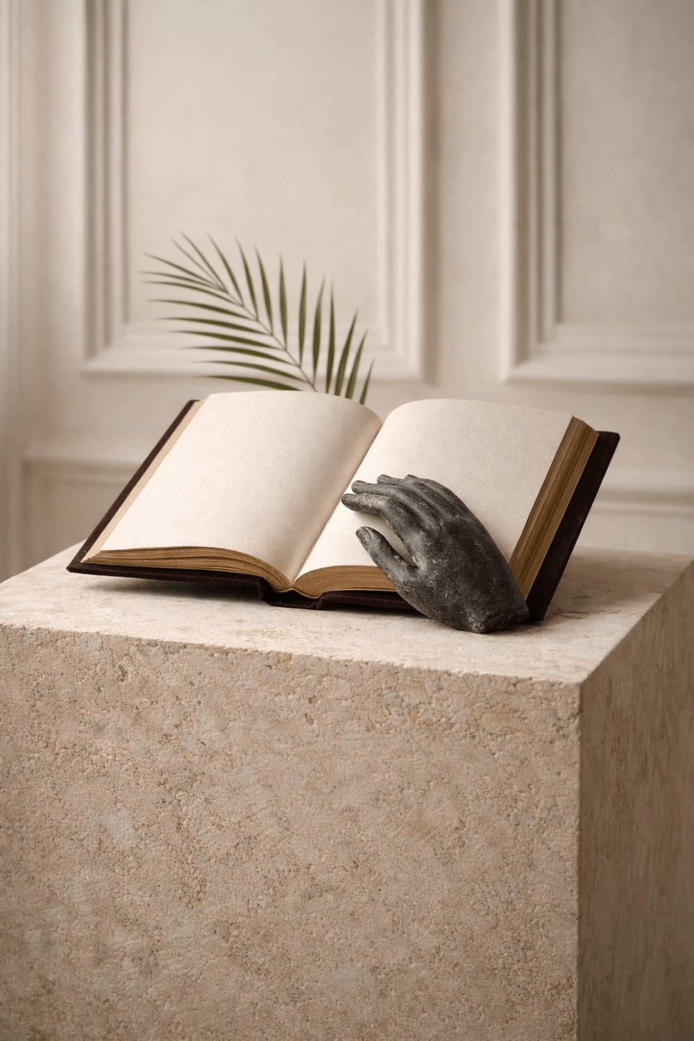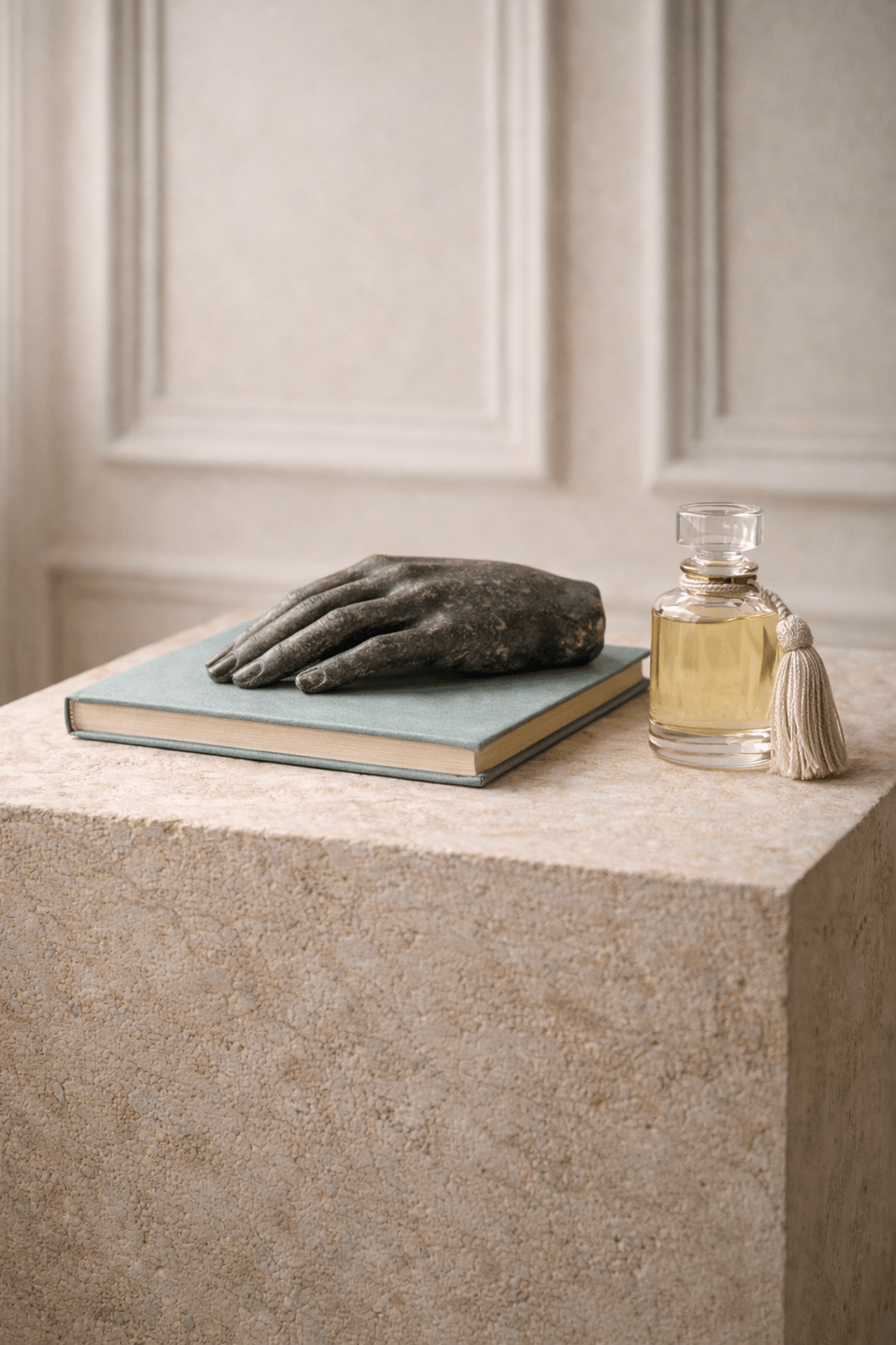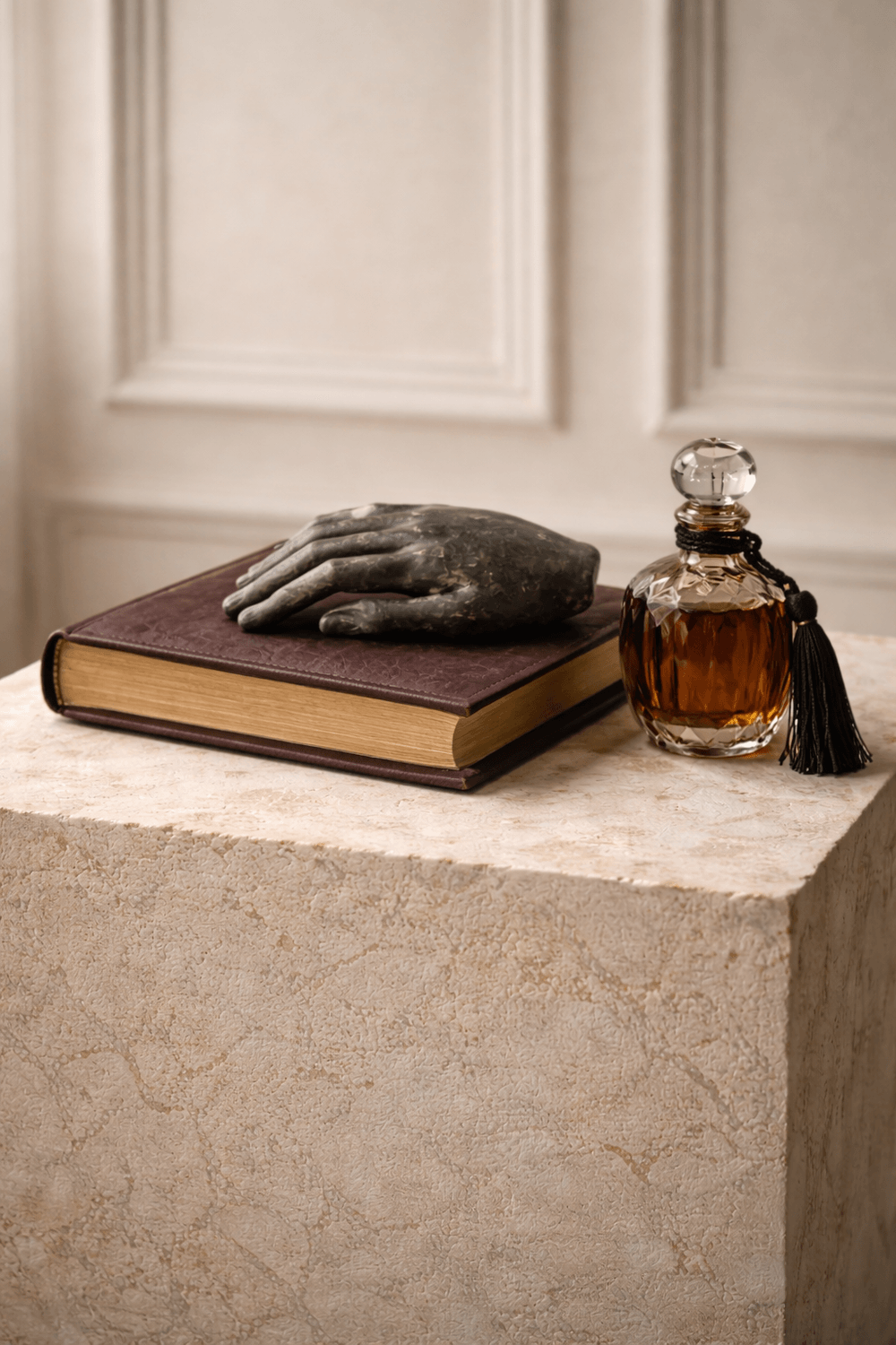 The book’s blank pages are steeped in perfume. Held open by a sculptural hand, it releases scent as if it were a text: quietly, gradually, through air and time. An object of wonder fragrance becomes the story.